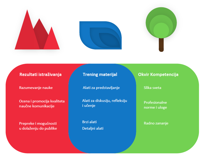 Zeleno drvo predstavlja naš model nivoa kompetencija naučnih komunikatora. Ovde smo predstavili različite aspekte veština koje su potrebne komunikatoru, počevši od spoljnih slojeva ka unutrašnjim. Sumirali smo osnovne ideje ciljeva treninga. Trening naučne komunikacije treba da poboljša veštine u naučnoj komunikaciji, ali i da omogući studentima da preuzmu odgovarajuće uloge kao profesionalni komunikatori. Ukratko smo objasnili tri različita nivoa kompetencija koje treningom treba ojačati: slika sveta, profesionalne norme i uloge i praktično znanje.